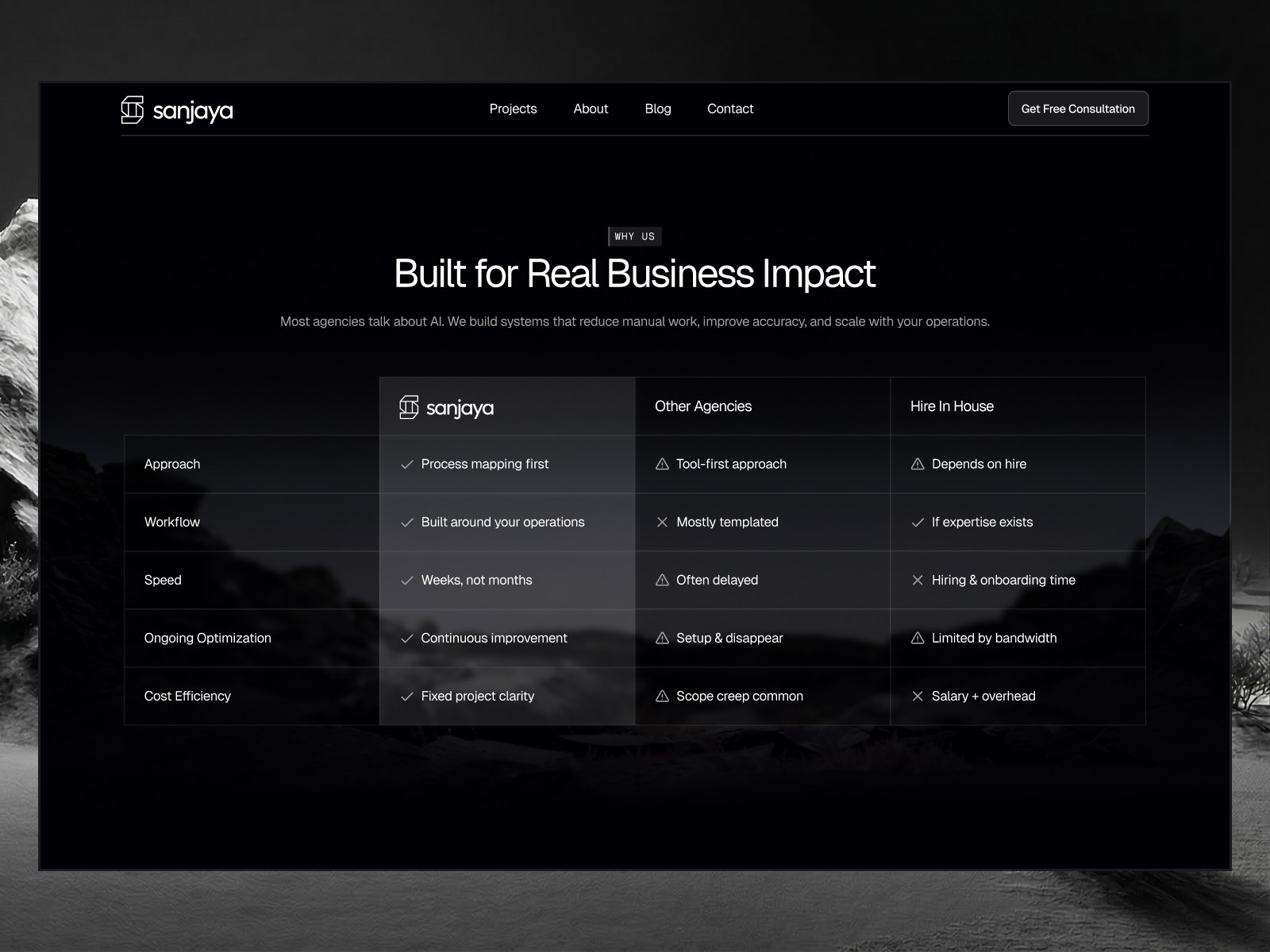 Get more discovery calls, build instant credibility, and look like the premium AI agency you are. Sanjaya is a Framer template designed specifically for automation and AI consulting businesses.